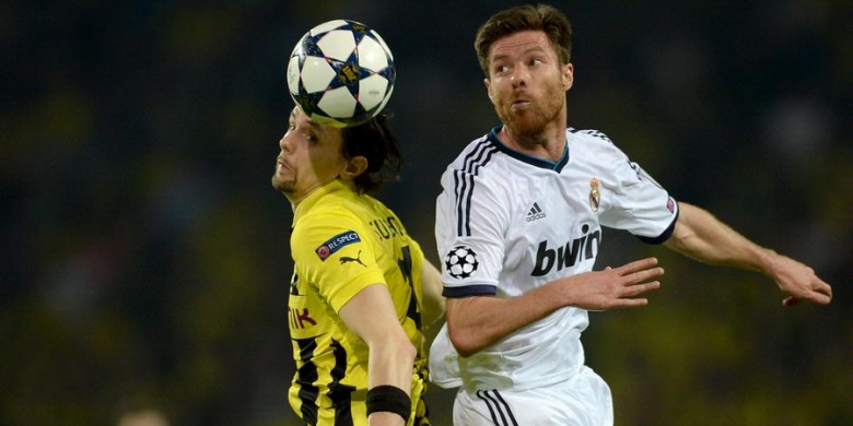 Gelandang Real Madrid, Xabi Alonso (kanan), berebut bola dengan bek Borussia Dortmund, Neven Subotic, pada pertandingan leg pertama semifinal Liga Champions, di Signal Iduna Park, Rabu (24/4/2013).MADRID, KOMPAS.com — Gelandang Real Madrid, Xabi Alonso, membantah kabar yang mengatakan ia siap menerima ajakan Jose Mourinho bergabung ke Chelsea. Alonso menegaskan tak ada kemungkinan ia kembali bermain di Premier League.