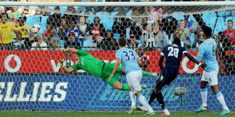 Striker Supersport United, Mame Niang (nomor 20), sukses membobol gawang Manchester City pada laga persahabatan di Stadion Loftus Versfeld, Pretoria, Minggu (14/7/2013). Supersport menang 2-0 atas Manchester City melalui gol Niang dan Kermit Erasmus.PRETORIA, KOMPAS.com - Setelah sebelumnya David Moyes menjalani debut bersama Manchester United dengan kekalahan di Thailand, Manajer Manchester City, Manuel Pellegrini, ikut-ikutan. Dalam debutnya mengasuh The Citizens pada pertandungan lawan klub Afrika Selatan, Supersport United, di Stadion Loftus Versfeld, Minggu (14/7/2013), ia harus menerima kekalahan 0-2.